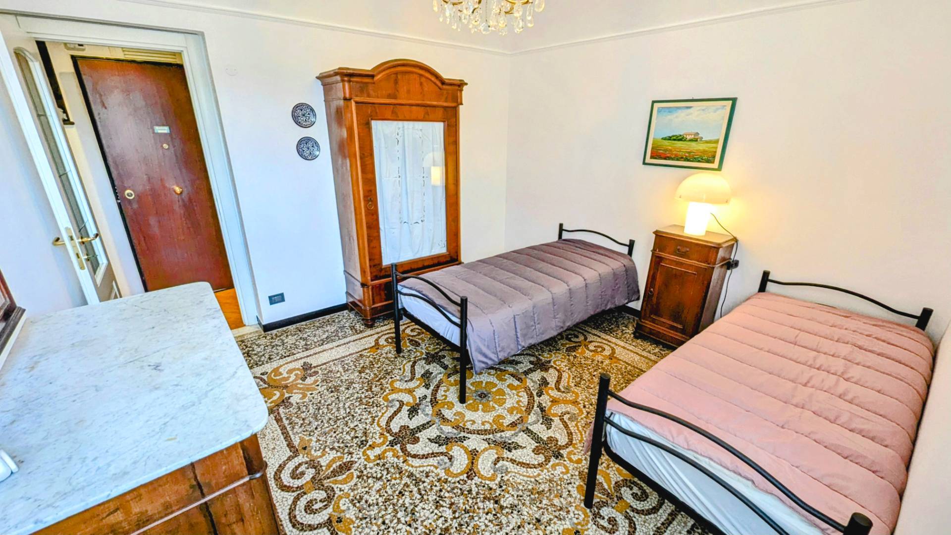 COMPOSIZ. VANI / DISTRIBUZ. POSTI LETTO: ingresso, camera matrimoniale, camera con divano letto singolo e rete singola, sala con cucina a vista, bagno (doccia).